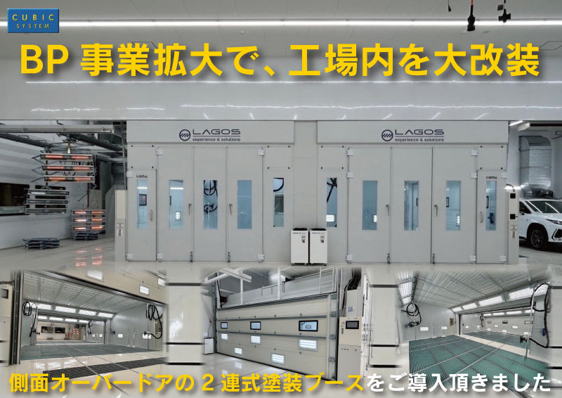 BP事業拡大で、工場を大改装し2連式の塗装ブースをはじめ、3面の修正装置・5面の集塵面をご導入頂きました。
