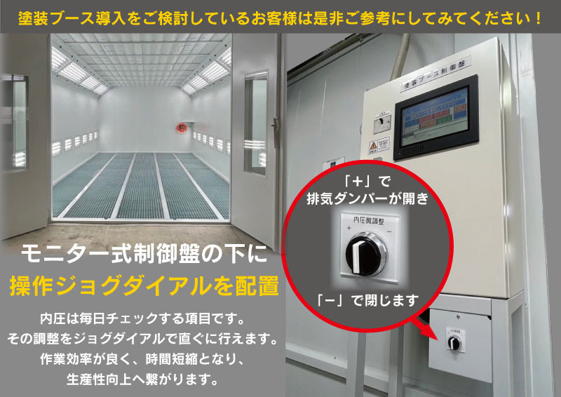 - モニター式制御盤の下に操作ジョグダイアルを配置し、目の前の内圧計(マノメーター)を見ながら「+」「-」調整が可能となっております。 「+」で排気ダンパーが開き 「-」で閉じます。