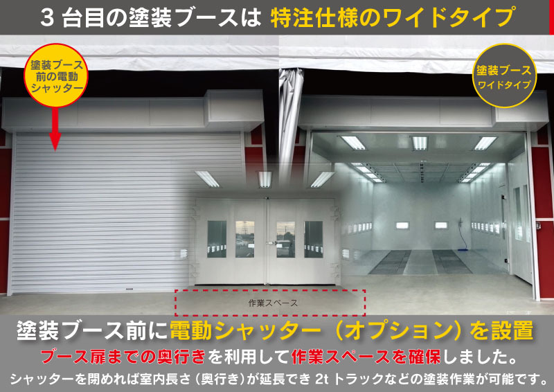 - 塗装ブース前に電動シャッター(オプション)を設置しブース扉までの奥行きを利用して作業スペースを確保いたしました。