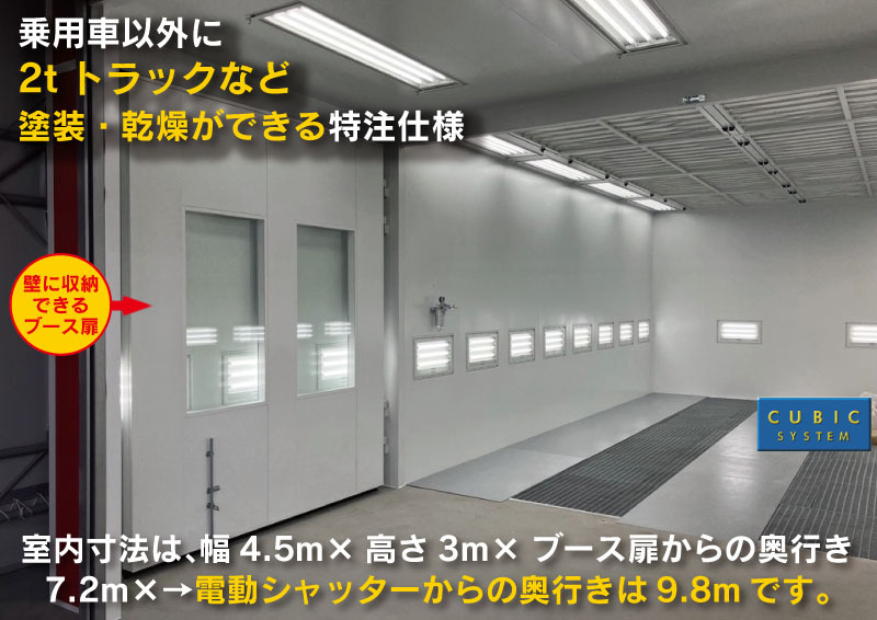 そして今回は、お客様より「乗用車以外に2tトラックなどの塗装・乾燥ができる特注仕様にして欲しい」御要望がございました。