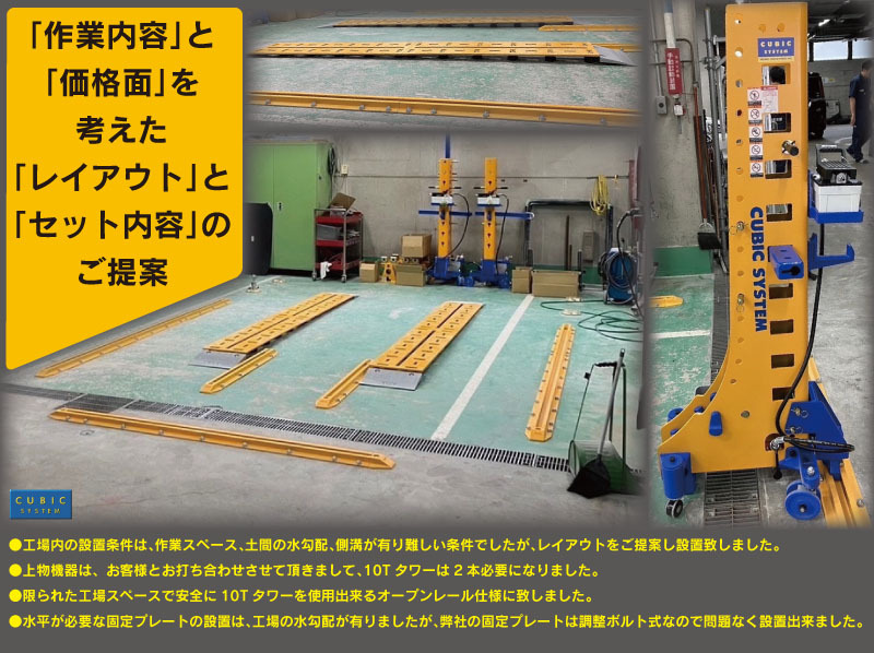 - レイアウトは、限られた工場スペースで安全に10Tタワーを使用出来るオープンレール仕様に致しました。