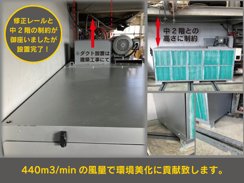 • 浮遊するパテ粉や、鉄粉、溶接ヒュームなども強力に集塵する能力を求めておられましたので、7.5kwの両口シロッコファンとインバータ仕様にて設計しました。440m3/minの風量で環境美化に貢献致します。