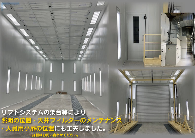 - リフトシステムの架台等により「照明の位置・天井フィルターのメンテナンス・人員用小扉の位置」等にも工夫致しました。