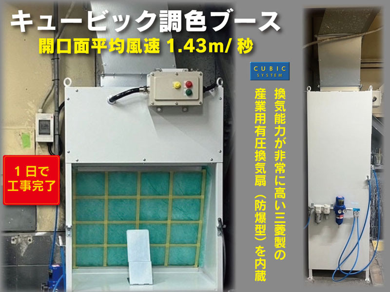 - キュービック調色ブースには、開口面平均風速1.43m/秒と、換気能力が非常に高い三菱製の産業用有圧換気扇(防爆型)が内蔵されています。