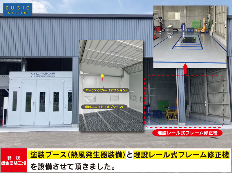 塗装ブース(熱風発生器装備)と埋設レール式フレーム修正機を設備させて頂きました。
