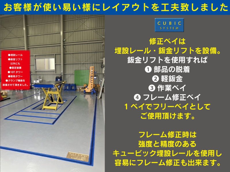鈑金リフトを使用すれば、部品の脱着・軽鈑金・作業ベイ・フレーム修正ベイとして、1ベイでフリーベイとしてご使用頂けます。フレーム修正時は、強度と精度のあるキュービック埋設レールを使用し、容易にフレーム修正も出来ます。