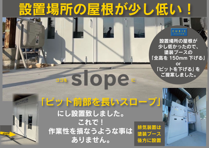 - 設置場所の屋根が少し低かったので、塗装ブースの「全高を150mm下げる」or「ピットを下げる」のご提案。 最終的に「ピット前部を長いスロープ」にし、設置致しました。