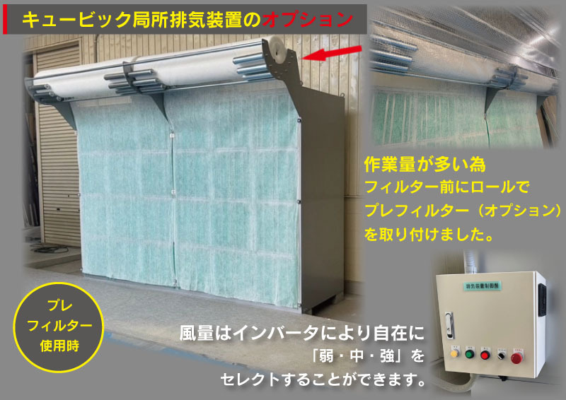 - 作業量が多いので、フィルターの前に、ロールでプレフィルター(オプション)を取り付けました。詰まれば簡単に巡って作業性が戻るよう設計しています。