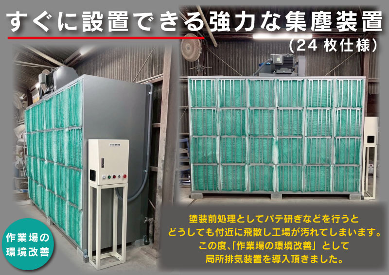 塗装前処理として、パテ研ぎなどを行うと、どうしても付近に飛散し工場が汚れてしまいます。