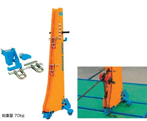 タワーを動かすことなくタワーを中心に左右140°動き高さ調整もできるので安全にアッパー方向への引きが可能です。また、エンジンの脱着も可能です。(耐荷重1トン)