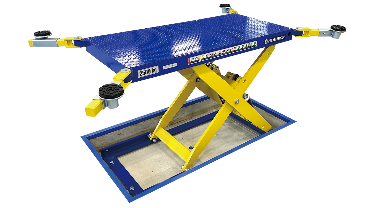 能力2.5tで軽四輪車から大型車まで、らくらくリフトアップ。サンディング・下回りの軽整備まであなたの作業を効率化。また、フロアー修正システムと組み合わせることにより固定作業も更にスピードアップ。このリフトは、鈑金作業用に開発され、フロアー修正レールや床集塵装置などとの併用が可能です。そのため、最低高さ寸法は190mmとしながらも上昇揚程は950mmもあります。また、能力は軽四輪車から大型乗用車までをリフトアップできるように、油圧2シリンダーで2.5tの能力があります。車体固定時やバンパー脱着、サイドステップやドアー下部のパテ研ぎなど、あらゆる作業のスピードアップに役立つリフトシステムです。