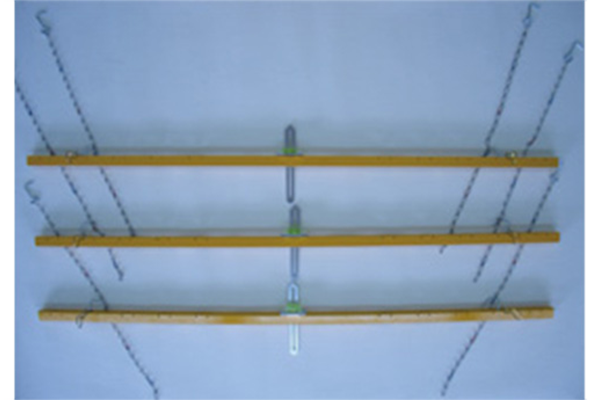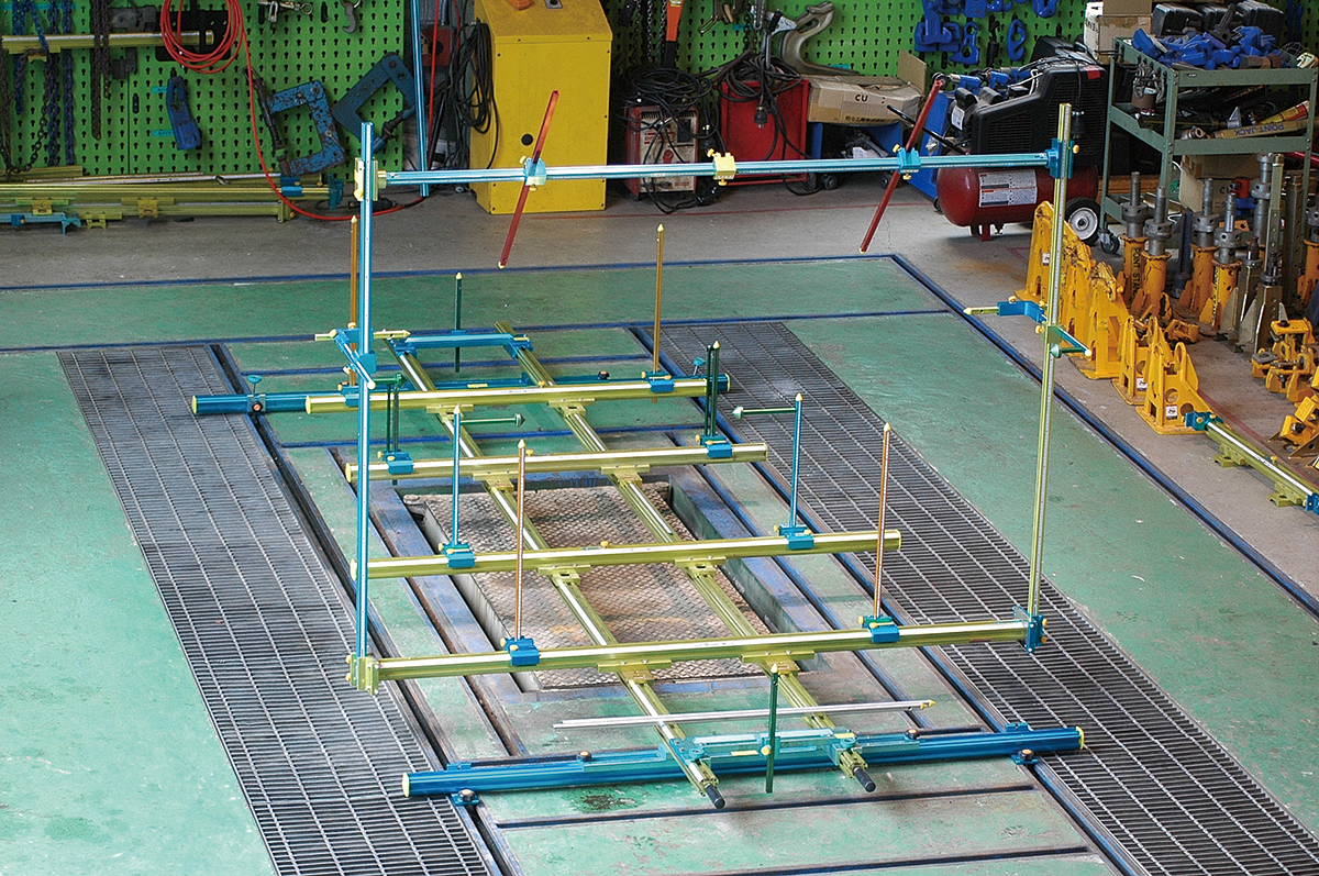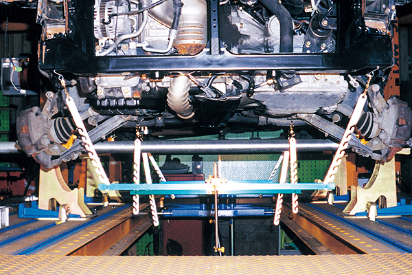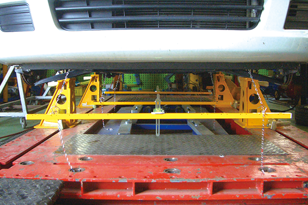 左右の測定ポイントにゲージを吊し、曲がり、歪み、菱曲がりを測定できます。