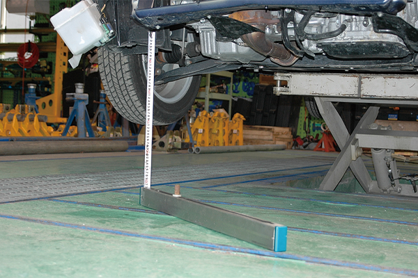 大がかりなゲージを使わず、車体の下にもぐらずに簡単にボデーの高さを測定することができます。レバーを左右に動かすことでメジャーが伸縮し、フレームの上がり下がりを650mmまで計測することができます。